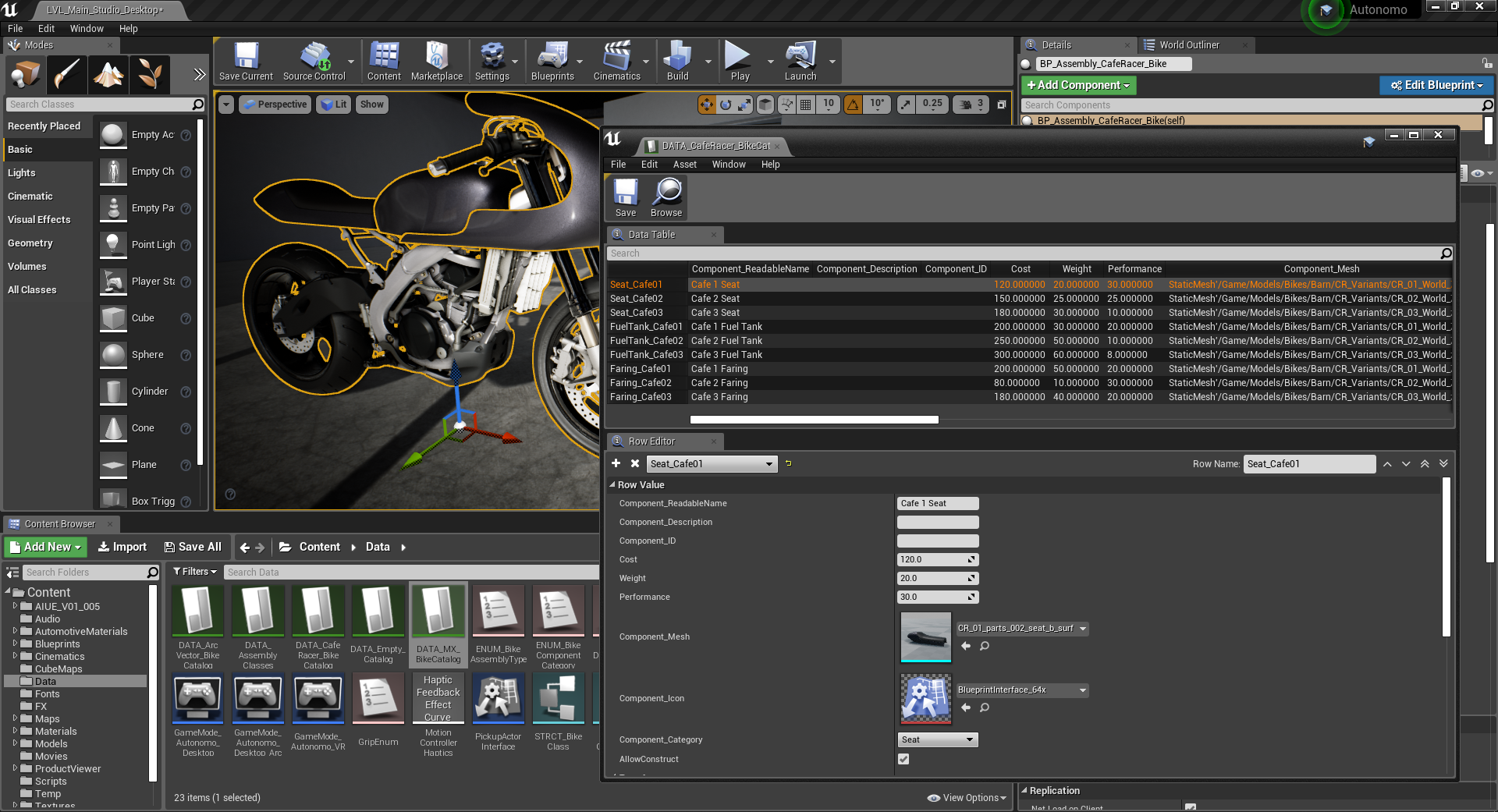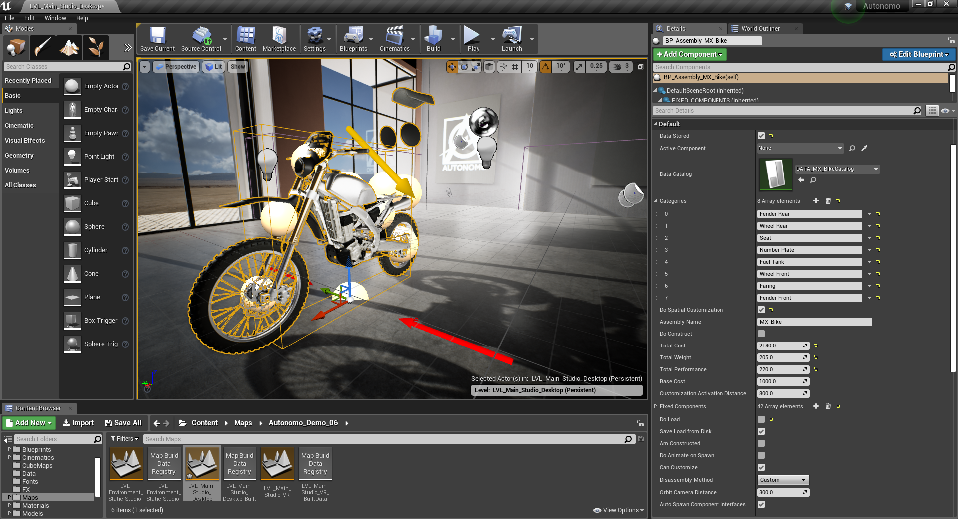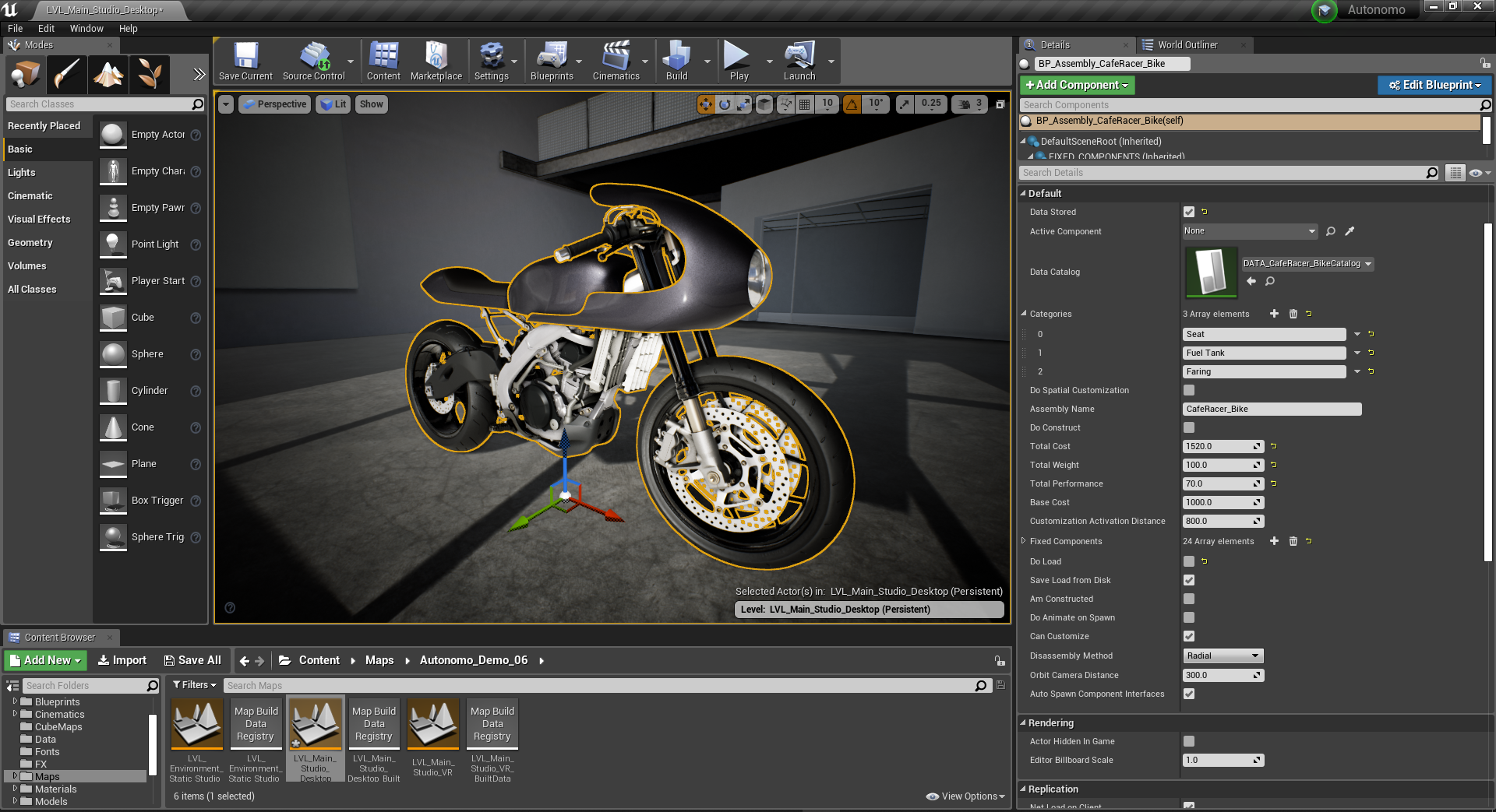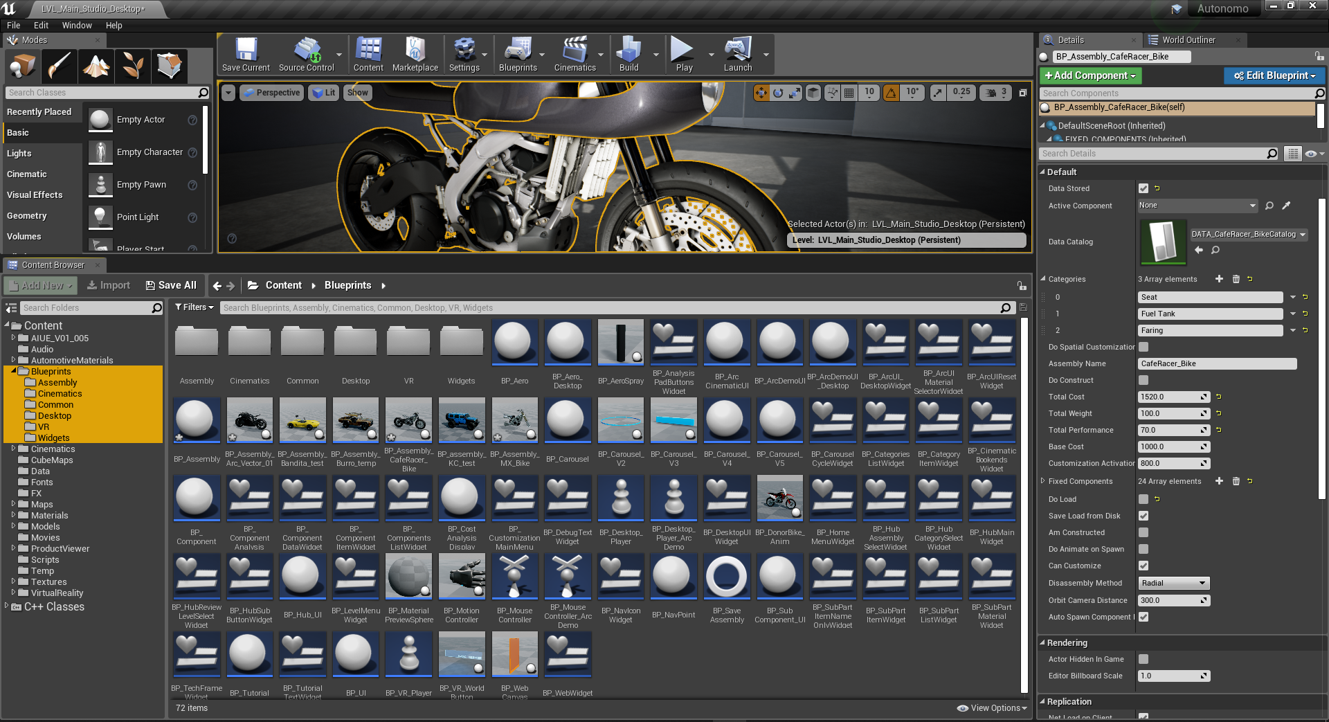I had the pleasure of working on a proof of concept project for US startup company “Hackrod” specialising in generative design and new forms of manufacturing to fundamentally disrupt the vehicle configuration process. I worked on the very first iteration of the “Autonomo” platform, built using the Unreal Engine. The platform had both desktop and VR interaction models that would allow a user to select and configure a custom vehicle, in the prototype this was a motorcycle, and was built to utilise a database back-end that could be updated by vendors through a set of custom tools.