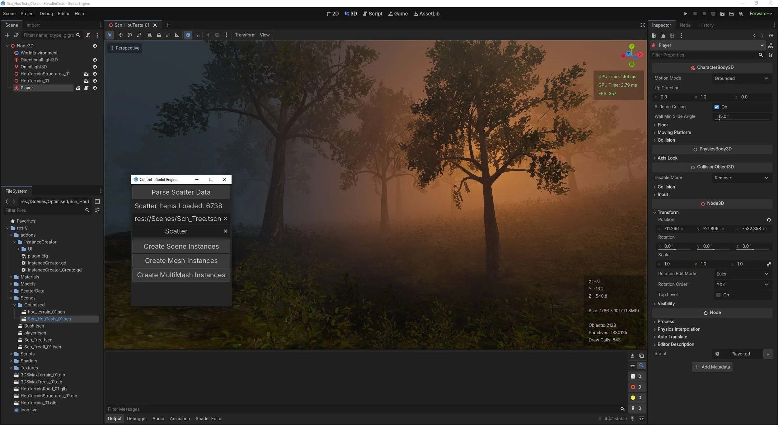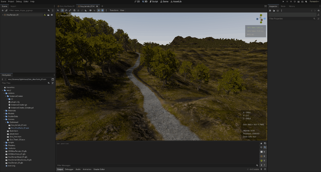 One of the first projects I set myself was to get to grips with the general pipeline, how to get data into the engine, how to read and write arbitrary data to and from disk, how to build custom tools to solve workflow demands. This project took the form of a 2k by 2k landscape, authored as mesh chunks in Houdini, and populated with scattered foliage generated in Houdini and stored as point data in a text file that could be parsed by my own custom add-on in order to place individual mesh instances or to generate multi-mesh instances. In order to achieve more granular culling with the MMI’s my custom pipeline exported “chunks“ from Houdini that would output multiple MMI blocks in Godot.