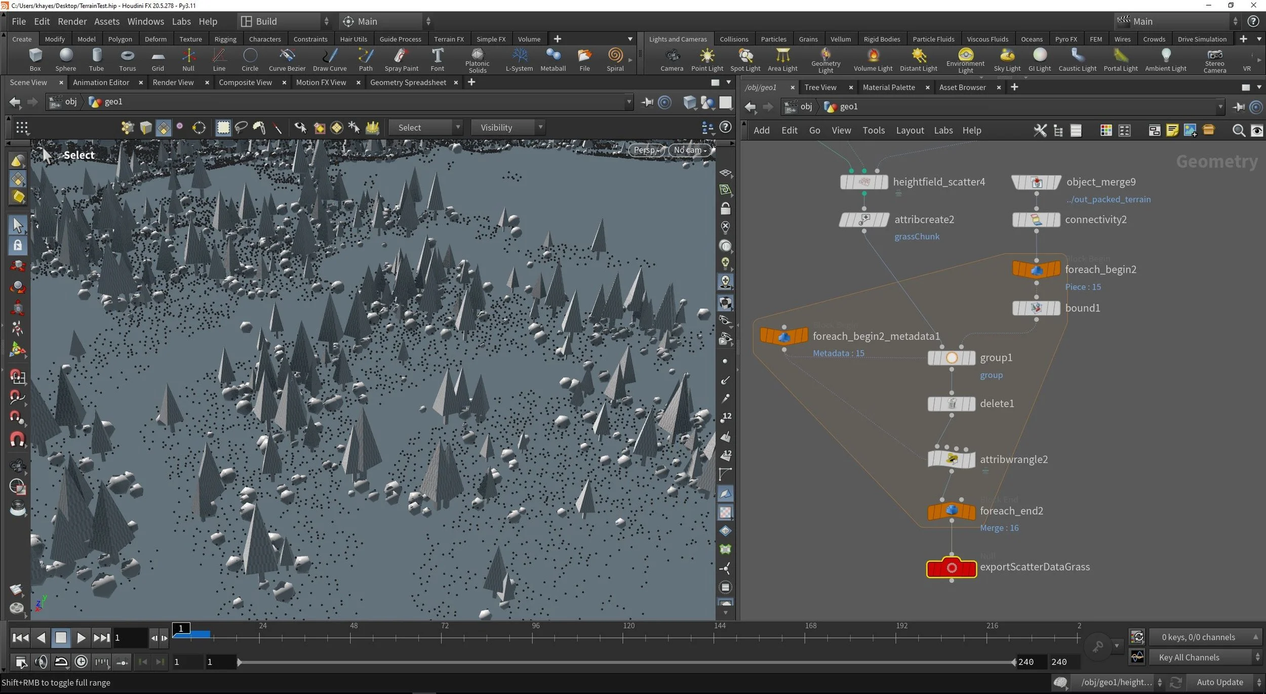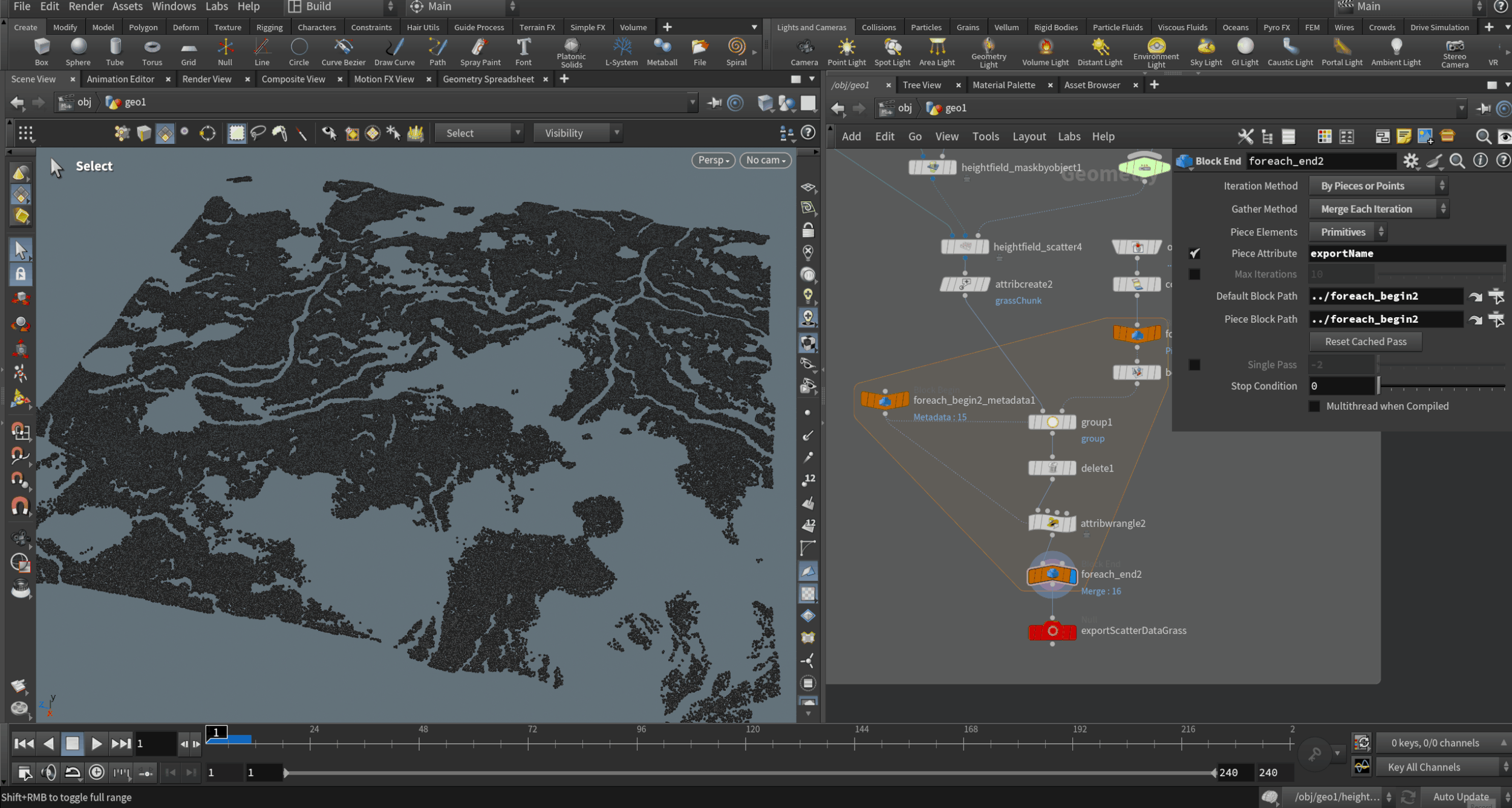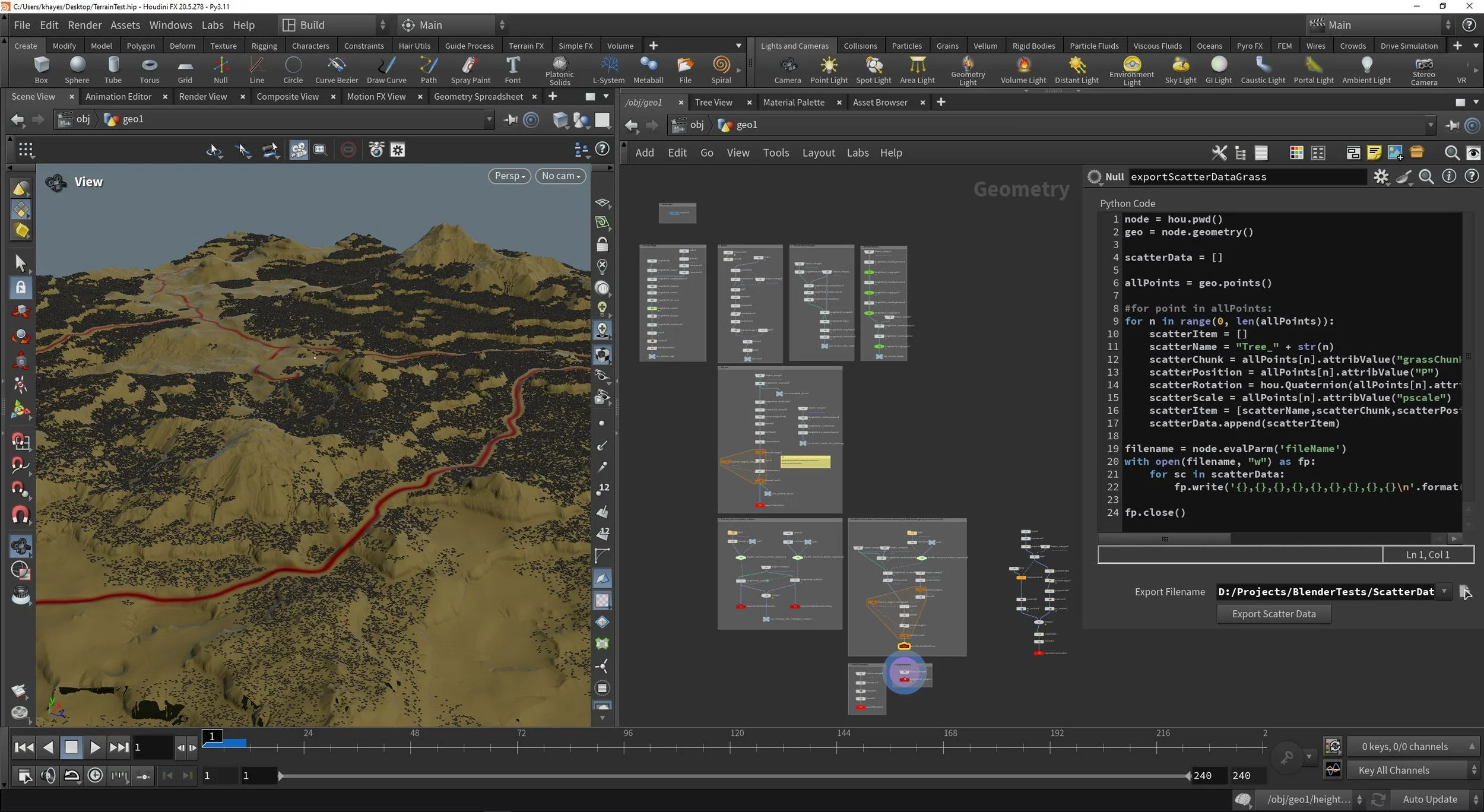 Shown here in the property editor in Houdini, you can see a snippet of my custom Python code responsible for writing out blocks of point data, in this case grass scatter. This included position, rotation, scale, and the chunk ID a given point was associated with.