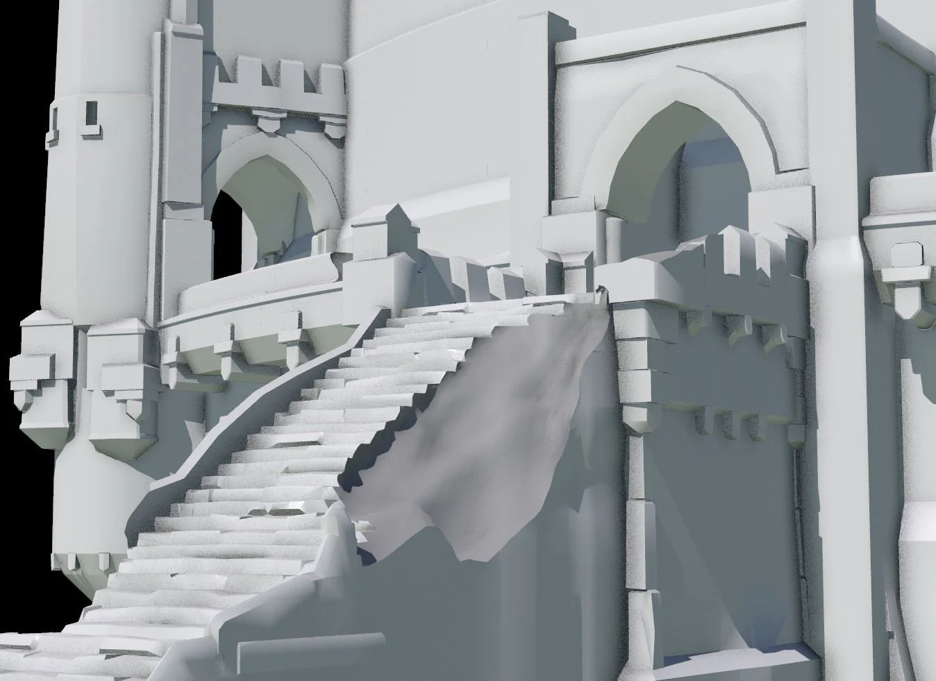 This section of the tower outer wall was back-lit in Unreal with shafts of volumetric light and reveals a flock of bats as the camera passes by.