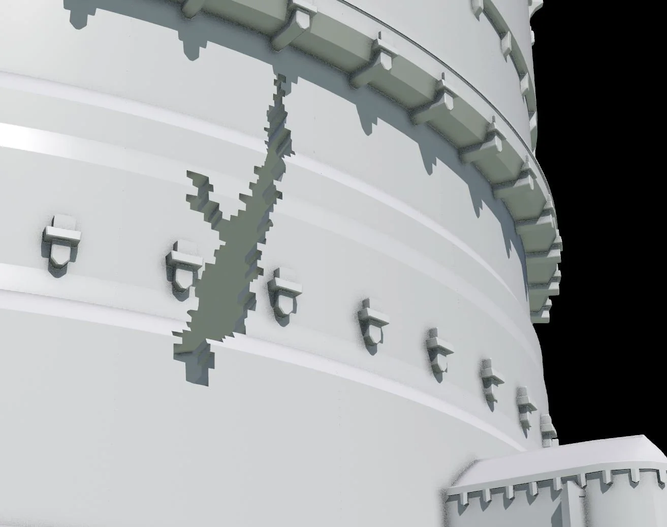 I could then build the tower up in sections using these modular elements, cloning and deforming into strips that could be bent into cylindrical layers and performing boolean operations to cut and merge details into place. I also had to introduce some rudimentary damage to indicate the age of the tower which would be detailed further in Unreal.