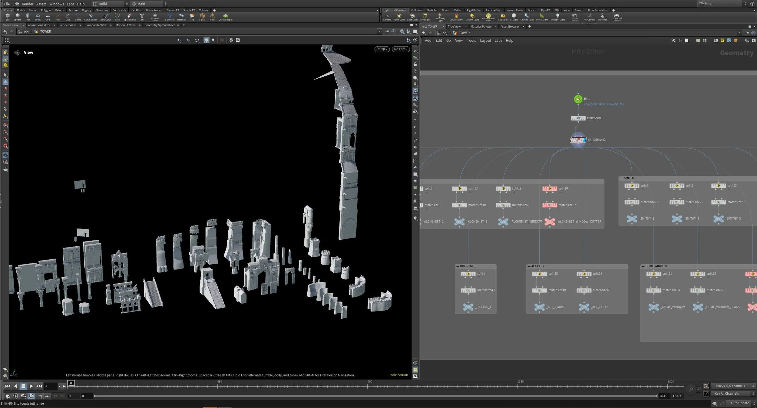 The first step in the construction of the tower used as the central element to the trailer, was to ingest the .fbx asset containing all the modular components and break them into more useable groups. This process also cleaned up any redundant attributes such as vertex colours whilst preserving UV’s and normal data.
